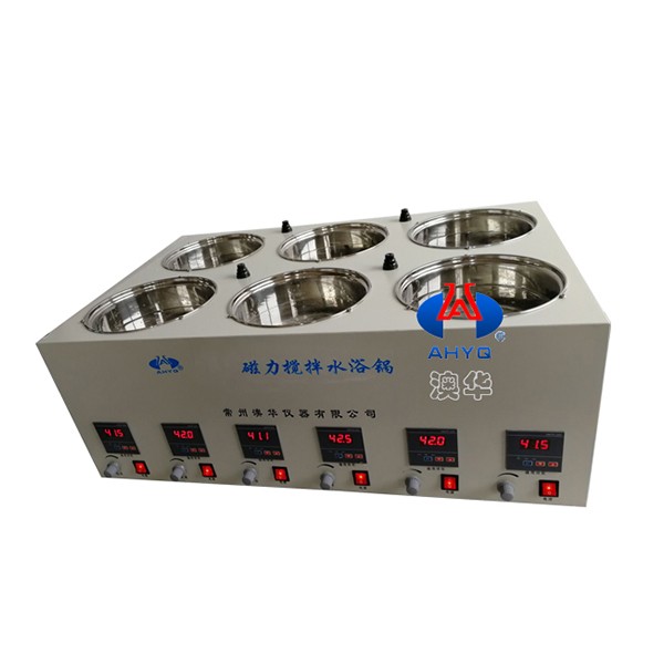 六位磁力搅拌数显恒温水浴锅是本公司新研发的一款实验室仪器,它可同时放置6个容器做试验,6个位可单独控制,可同时使用,也可单独使用,该仪器采用直流电机,噪声低、调速平稳、使用寿命长。不锈钢内胆耐腐蚀、易清洗。由聚四氟乙烯与优质磁钢精制而成的搅拌子,耐高温、耐磨、耐化学腐蚀、旋转力强、并可在密闭的容器中进行混匀工作,微电脑蕊片控温,精确度高,LED显示直观。