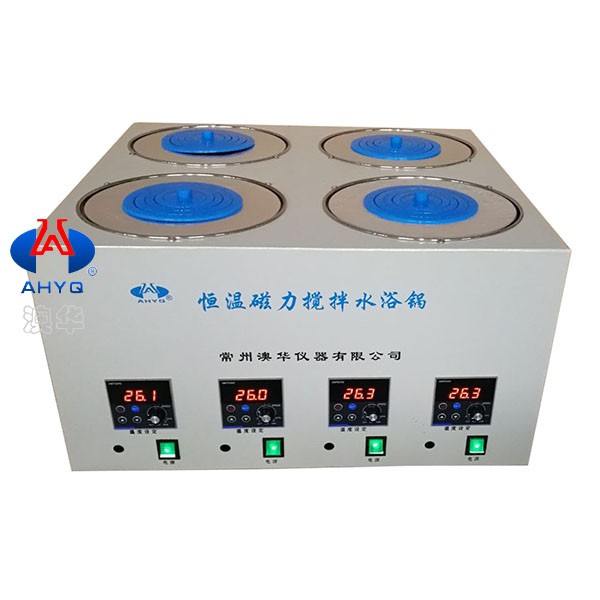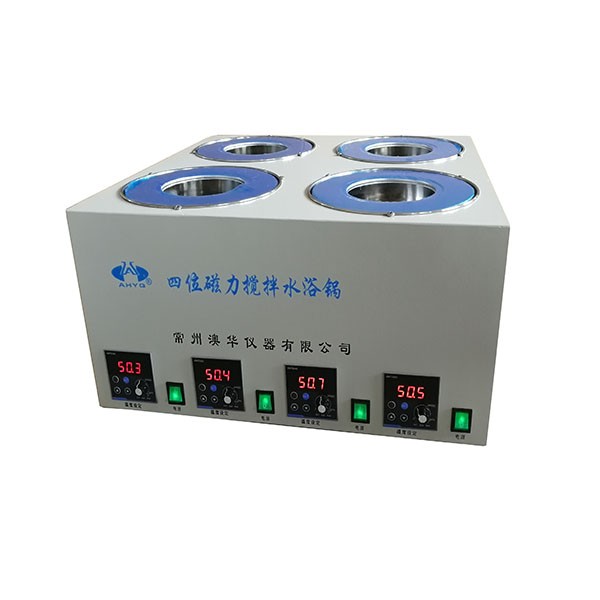 四位磁力搅拌数显恒温水浴锅是本公司新研发的一款实验室仪器,它可同时放置4个容器做试验,4个位可单独控制,可同时使用,也可单独使用,该仪器采用直流电机,噪声低、调速平稳、使用寿命长。不锈钢内胆耐腐蚀、易清洗。由聚四氟乙烯与优质磁钢精制而成的搅拌子,耐高温、耐磨、耐化学腐蚀、旋转力强、并可在密闭的容器中进行混匀工作,微电脑蕊片控温,精确度高,LED显示直观。